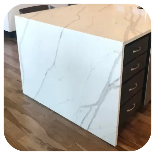 Waterfall countertops offer a modern design element that extends the countertop surface vertically along cabinetry edges, creating a continuous flow of material. Granite Countertop Elegance LLLP installs waterfall countertops made from premium granite and quartz, offering both durability and elegance. These installations create a striking visual centerpiece within kitchens while maintaining functionality and structural strength.